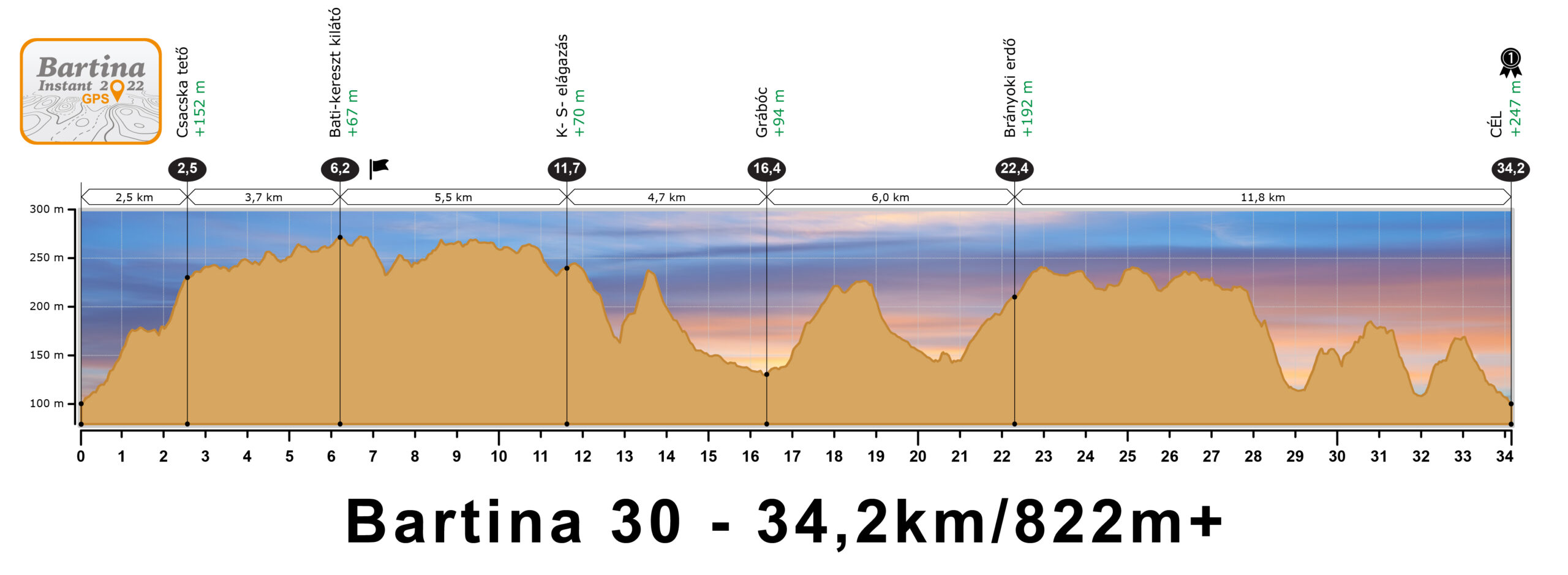 Távolság34.2kmSzint822mEsemény kezdete2022. január 29. 6:00Esemény vége2022. január 29. 17:30Szintidő10:20teljesítménytúrázásBartina 15