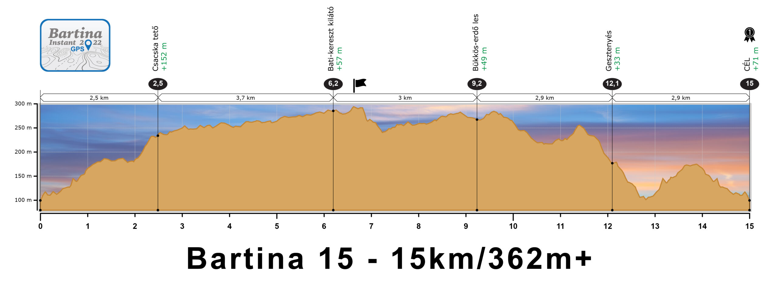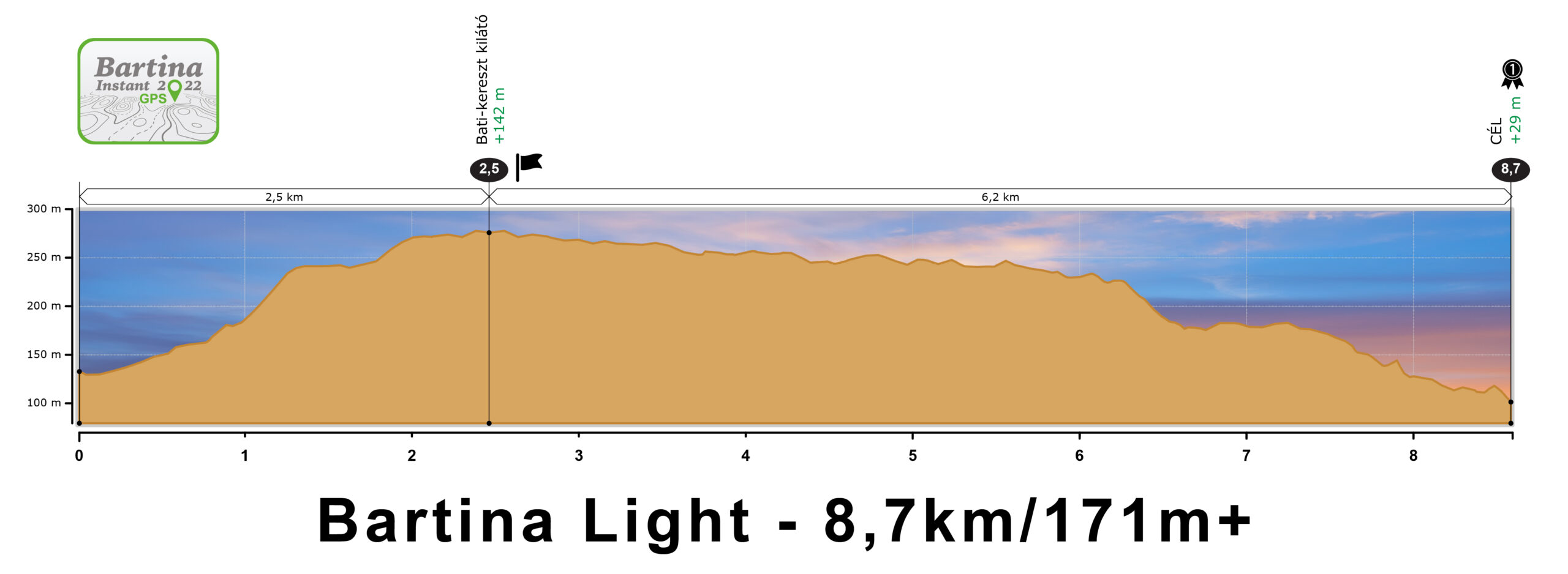 Távolság15kmSzint362mEsemény kezdete2022. január 29. 6:00Esemény vége2022. január 29. 17:30Szintidő5:50teljesítménytúrázásBartina Light