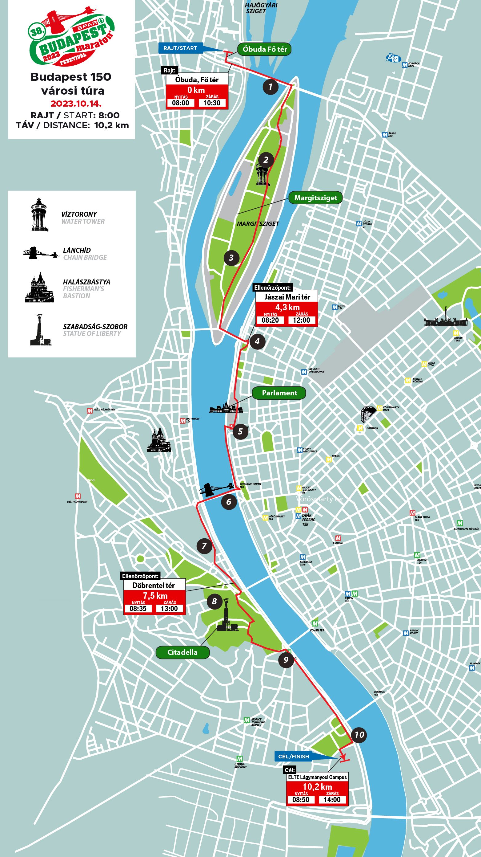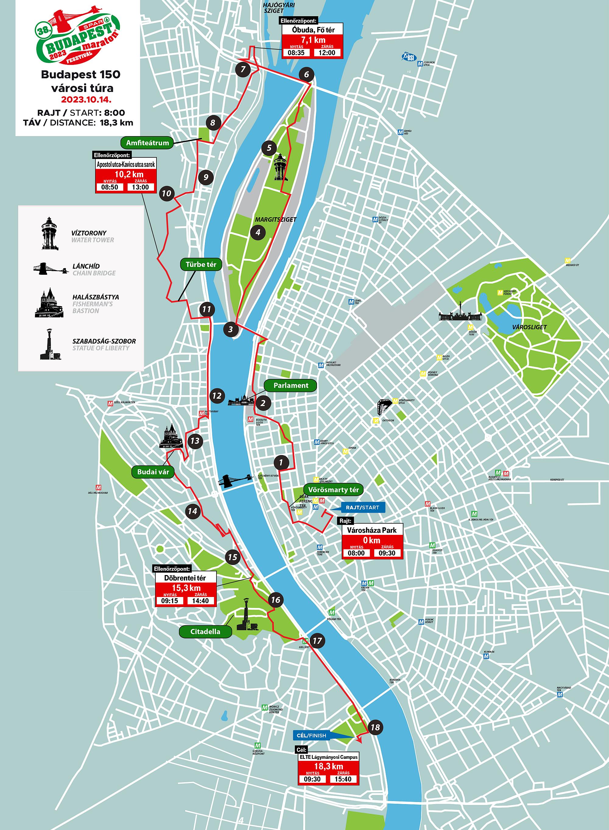 18 km túra útvonala (18,3 km): Budapest Városháza, Belváros, Margitsziget, Óbuda, Budai vár, Gellért-hegy, Műegyetem rakpart