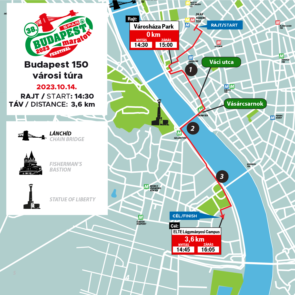 4 km túra útvonala (3,6 km): Budapest Városháza, Petőfi tér, Váci utca, Szabadság híd, Műegyetem rakpartÖtpróba esemény