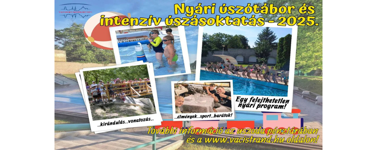 Örömmel jelentjük be, hogy a méltán sikeres és hosszú évek óta telt házzal üzemelő nyári úszótáborunk és intenzív úszásoktatás programunk idén nyáron is elindul! Úszótáborunk több turnusban, heti váltásokban indul, már fogadjuk a jelentkezéseket uszodánk jegypénztárában! A tábor bázisa a jól megszokott váci strand lesz, de számos városi helyszínt is felkeresünk majd a gyermekekkel. Meglátogatjuk majd a Duna-parti nagy játszóteret, sétálunk a hűs Ligetben, a városi kis-vonattal járjuk be Vác nevezetességeit! Régi barátaink a váci tűzoltóállomás kedves váci dolgozói, akik töretlen lelkesedéssel mutatják be speciális járműveiket és eszközeiket. A finom meleg ebédhez sem kell sokat sétálnunk, hiszen az étterem közvetlen az uszoda szomszédságában helyezkedik el. A strand árnyékos részein pedig sok-sok játékra van lehetőség, társasjáték, kártyázás, labdázás, tollaslabda versenyek színesítik a vizes programokat!
