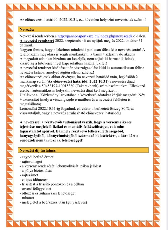 Lemondást 2022. 10. 31-ig fogadunk el, ilyen esetben a befizetett összeg 80%-át visszautaljuk. A nevezés át is ruházható az előnevezés határidejéig!