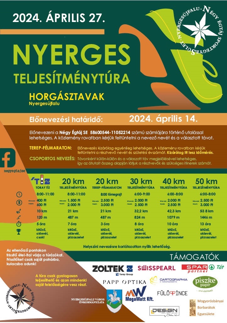 Távolság32.2kmSzint824mEsemény kezdete2024. április 27. 6:00Esemény vége2024. április 27. 17:00Szintidő8:00teljesítménytúrázásNyerges 20